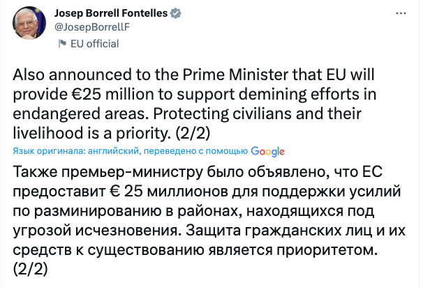 Также он объявил, что ЕС предоставит 25 млн евро на разминирование украинских территорий.