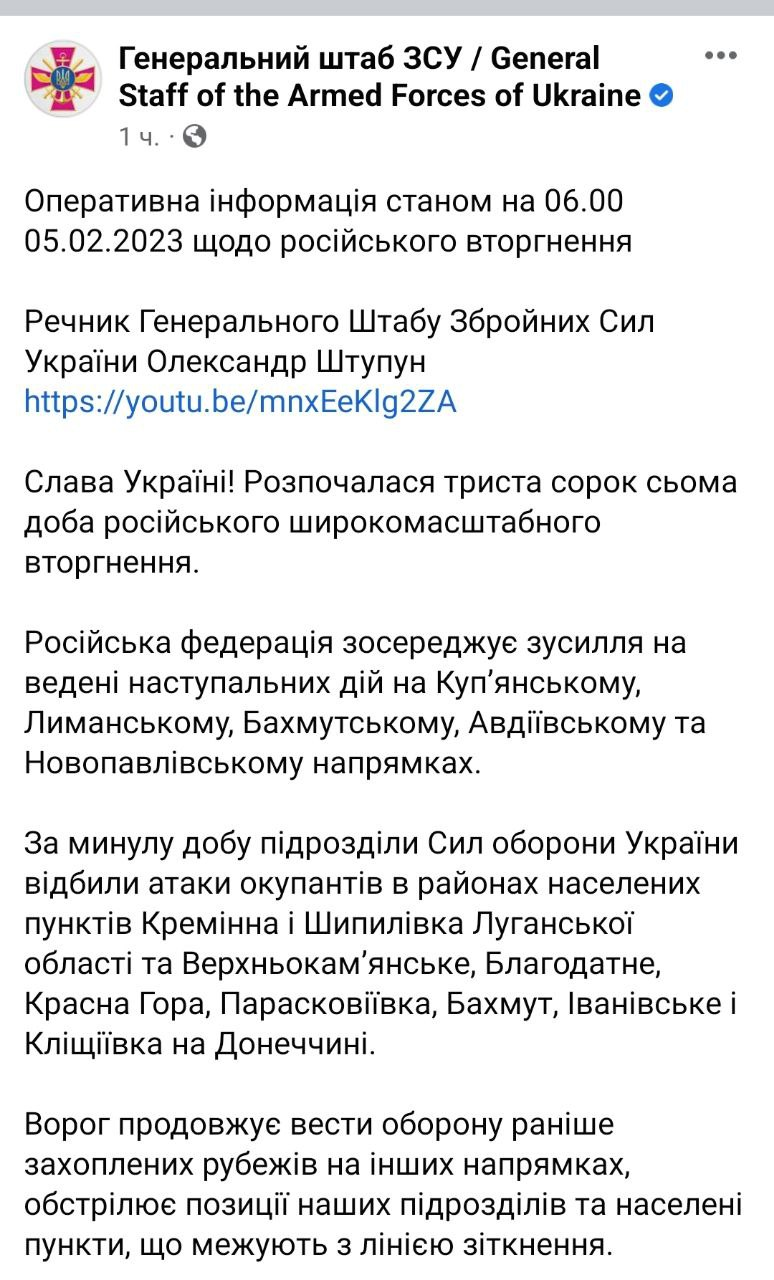 Война в Украине продолжается уже 347-й день. Мы следим за новостями 5 февраля в своем онлайне.
