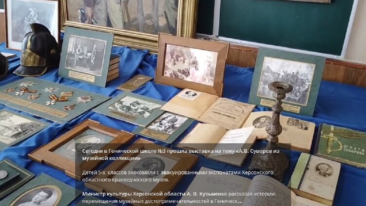 Сообщается, что оккупационное "Министерство культуры Херсонской области" опубликовало видео, где демонстрируются экспонаты с музейной выставки, посвященной А. Суворову.