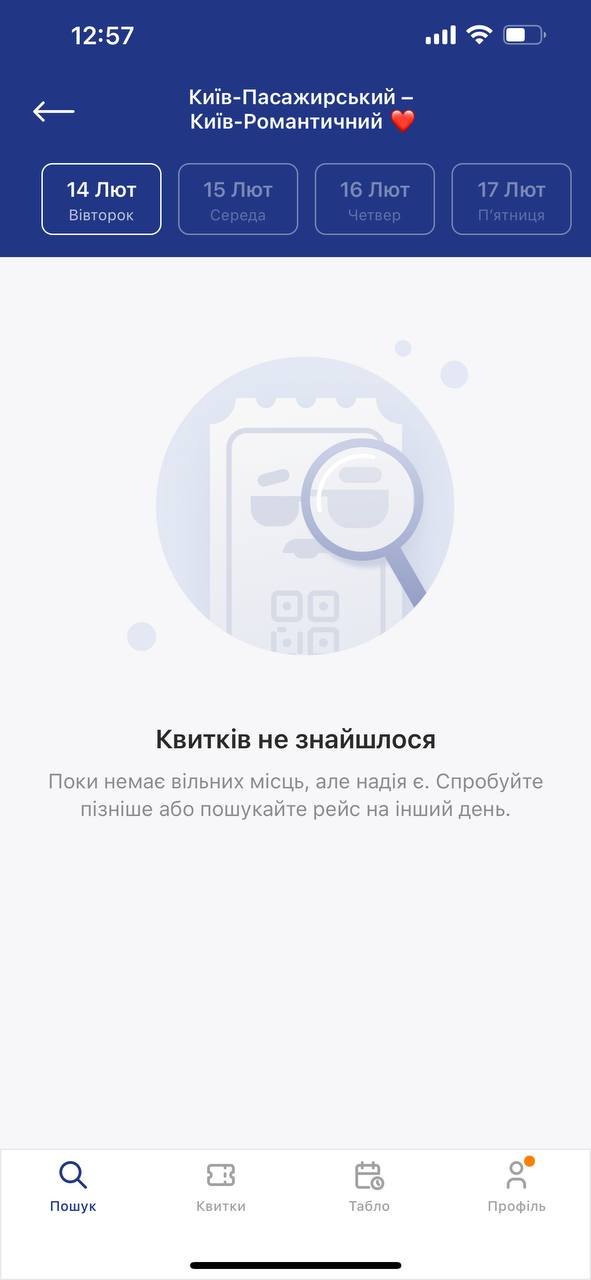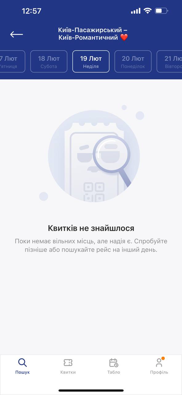 Однако на данный момент в мобильном приложении "Укрзализныця" доступных билетов нет.
