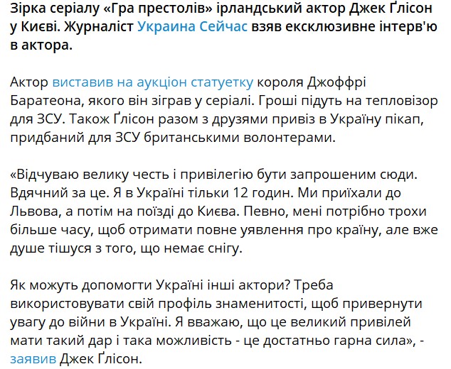 Ранее Глисон выставил на благотворительный аукцион статуэтку своего персонажа из "Игры престолов". Собранные средства он планирует отправить на помощь ВСУ.