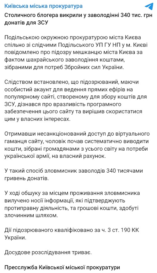 В прокуратуре заявили, что он узнал об уязвимости программного обеспечения этого сайта и решил воспользоваться этим в собственных интересах. В частности, он получил несанкционированный доступ к виртуальному кошельку и начал систематически выводить средства, которые собрали на нужды украинской армии. С помощью такой схемы он вывел 340 тысяч грн донатов.