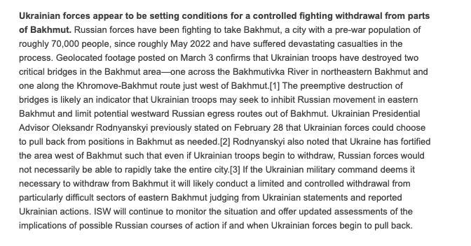 "Упреждающее разрушение мостов, вероятно, указывает на то, что украинские войска могут попытаться воспрепятствовать передвижению русских в восточной части Бахмута и ограничить потенциальные пути отхода русских из Бахмута на запад", - говорится в отчете.