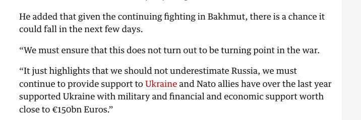 14:39 Генсек НАТО допустил падение Бахмута "в ближайшие дни", пишет The Guardian.
