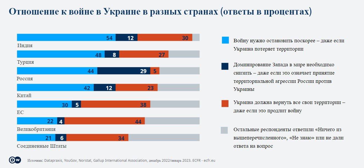 Также, несмотря на войну, большинство жителей Индии (80%), Китая (79%) и Турции (69%) считают Россию "союзником", либо "партнером". В Европе и США преобладает мнение, что Россия является "противником" или "соперником".