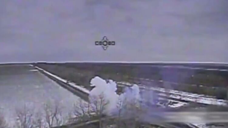 На видео можно заметить атаку дрона на российскую военную технику с символами вторжения, после чего съемка прерывается, что свидетельствует об уничтожении огнеметной системы.