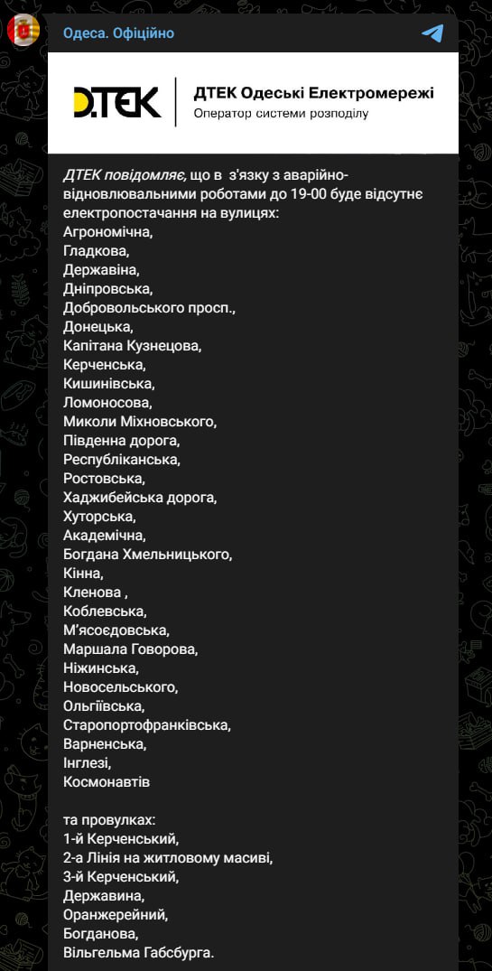В Одессе во вторник, 14 марта, на многих улицах до 19:00 отключили свет. Сообщают, что в связи с ремонтными работами.