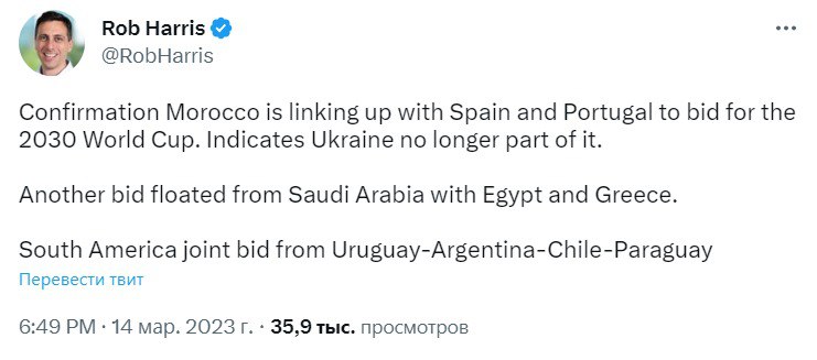 Украина исключена из совместной заявки с Испанией и Португалией на проведение чемпионата мира по футболу 2030.