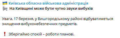 "Внимание, 17 марта, в Вышгородском районе будет происходить уничтожение взрывоопасных предметов", - указывается в сообщении в Телеграм-канале.