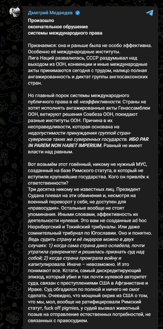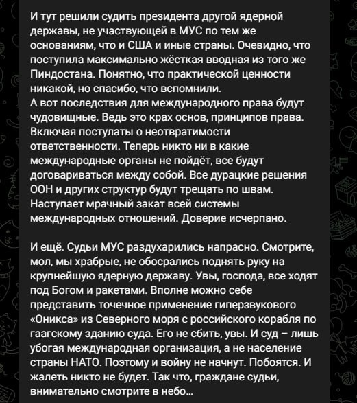 "Все ходят под Богом и ракетами. Вполне можно себе представить точечное применение гиперзвукового "Оникса" из Северного моря с российского корабля по гаагскому зданию суда. Его не сбить, увы. И суд – лишь убогая международная организация, а не население страны НАТО. Поэтому и войну не начнут. Побоятся. И жалеть никто не будет. Так что, граждане судьи, внимательно смотрите в небо", - написал Медведев.