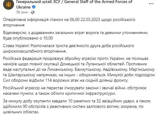 В среду, 22 марта, Генштаб ВСУ обнародовал сводку о ситуации на фронте.