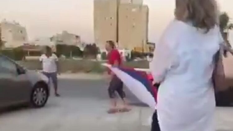 На видео, распространенных в социальных сетях, видно, как нападавшая держит в руках нож и, шатаясь, идет к небольшой группе людей, которые собрались с флагами РФ.