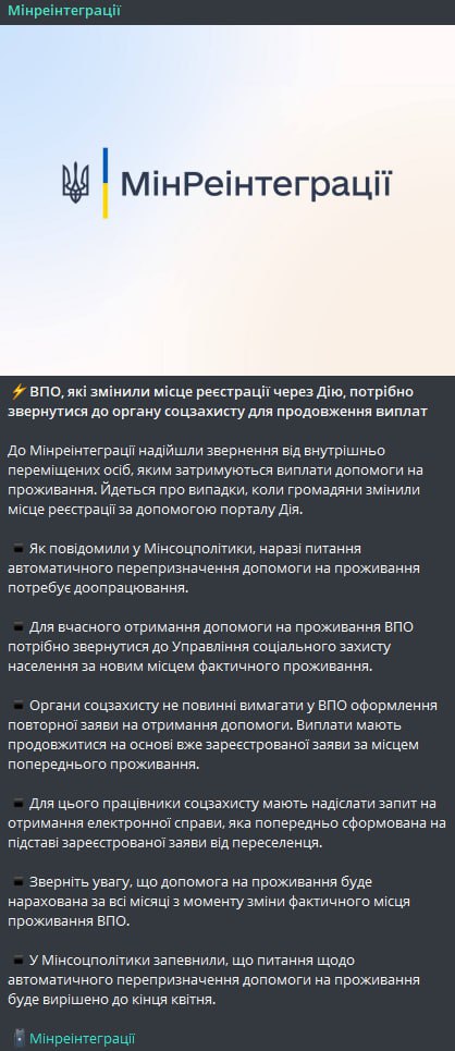 "Для своевременного получения помощи на жительство ВПЛ следует обратиться в Управление социальной защиты населения за новым местом фактического проживания. Органы соцзащиты не должны требовать у ВПЛ оформления повторного заявления на получение помощи. Выплаты должны продолжиться на основе уже зарегистрированного заявления по месту жительства", - сообщили в Минсоцполитики.