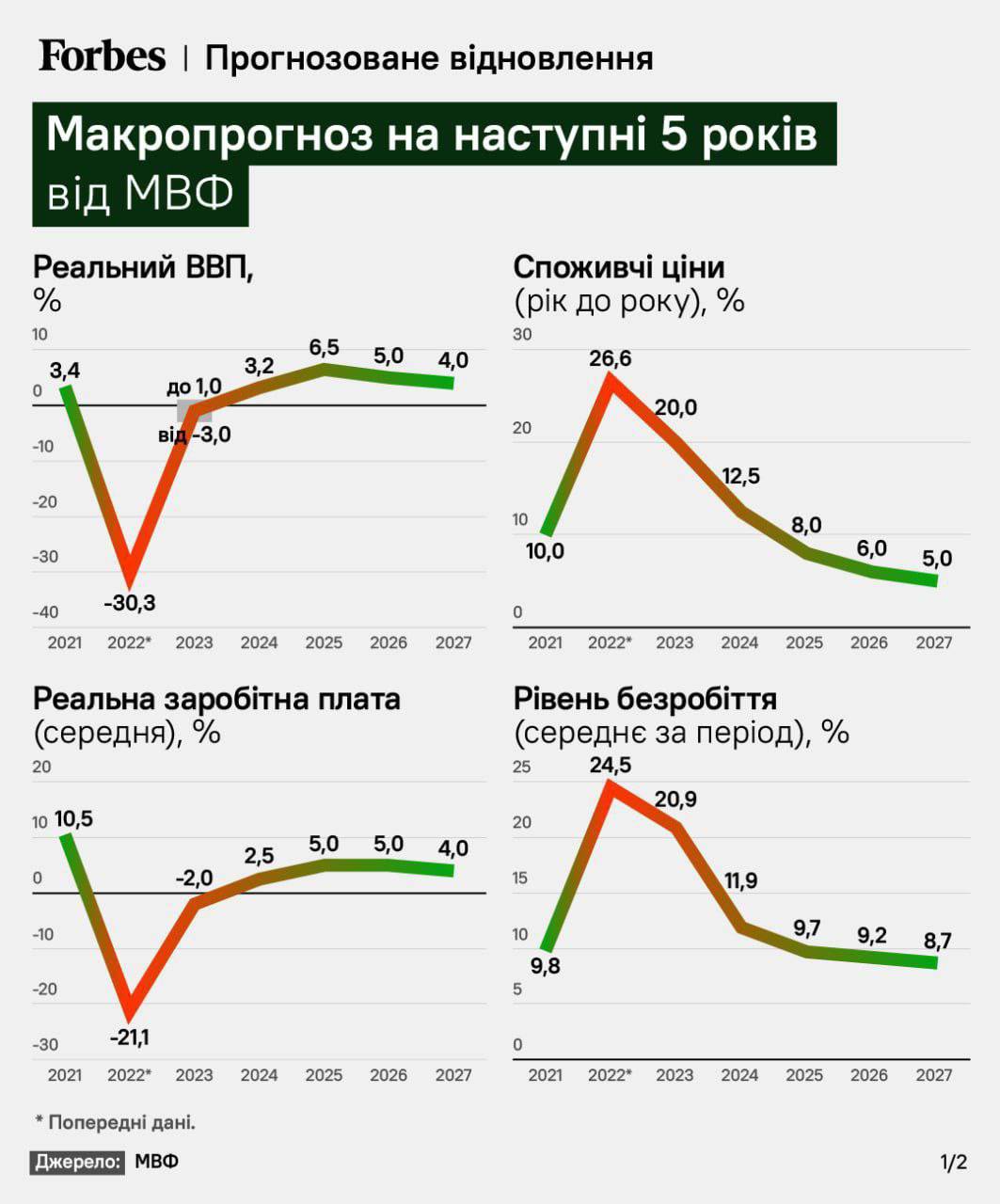 По инфляции прогнозы МВФ такие. В 2023 году она составит 20% (то есть уменьшится по сравнению с прошлогодней почти на 10%), в 2024 году - 12,5%, в 2025 году - 8%, в 2026 - 6%. К довоенному же уровню (5% в год) инфляция вернется только к 2027 году.