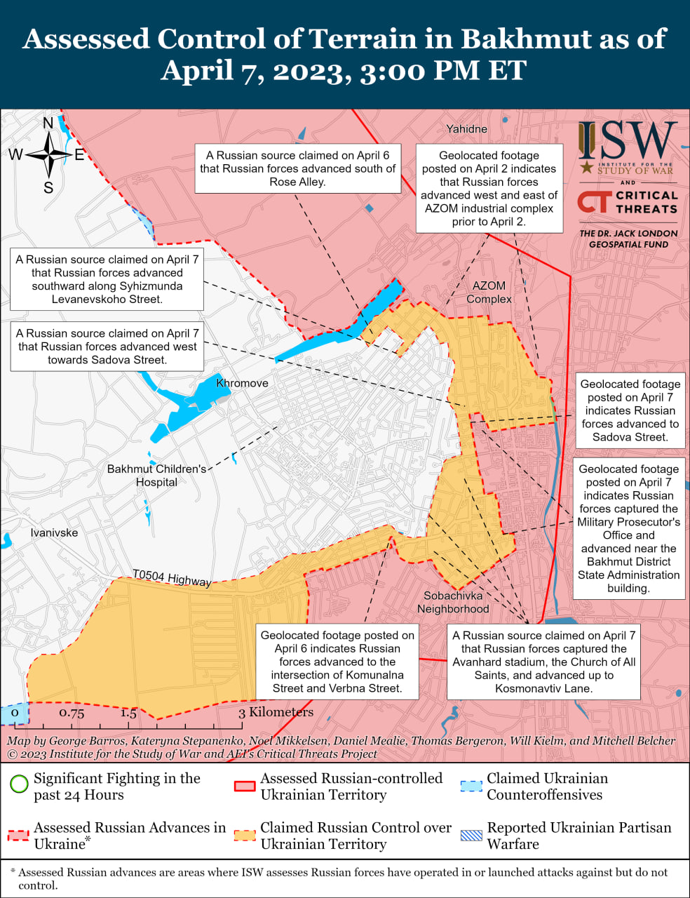 На кадрах с геолокацией, опубликованных 6 апреля, видно, что российские войска продвинулись примерно на три километра к югу от трассы Т0504 Константиновка — Часов Яр — Бахмут.