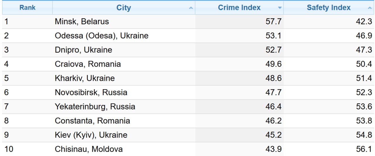 Сразу четыре украинских города вошли в десятку самых криминальных в странах Восточной Европы. Это Одесса (2-е место), Днепр (3), Харьков (5) и Киев (9).