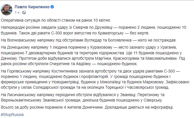 Он отметил, что в целом за минувшие сутки россияне нанесли удар из "Смерчей" по Дружковке, повредив 10 домов. Двумя ракетами С-300 - по Краматорску. Курахово обстреляли с "Ураганов", повредив семь двухквартирных домов и территорию предприятия. Еще 11 домов повреждены в Дачном.