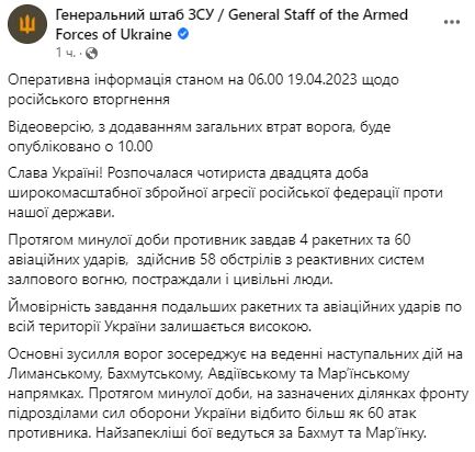 В среду, 19 апреля, Генштаб ВСУ обнародовал сводку о ситуации на фронте.