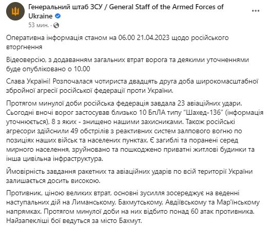 В пятницу, 21 апреля, Генштаб ВСУ обнародовал сводку о ситуации на фронте.