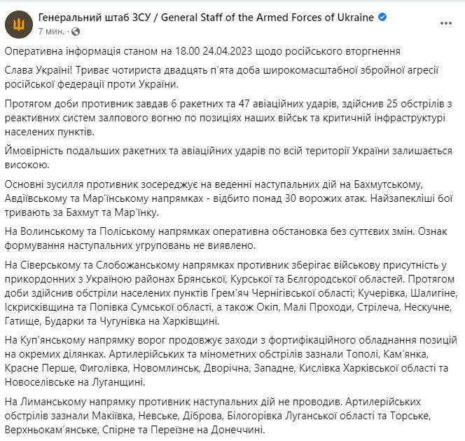 В понедельник, 24 апреля, в Украине идет уже 425-й день войны с Россией.