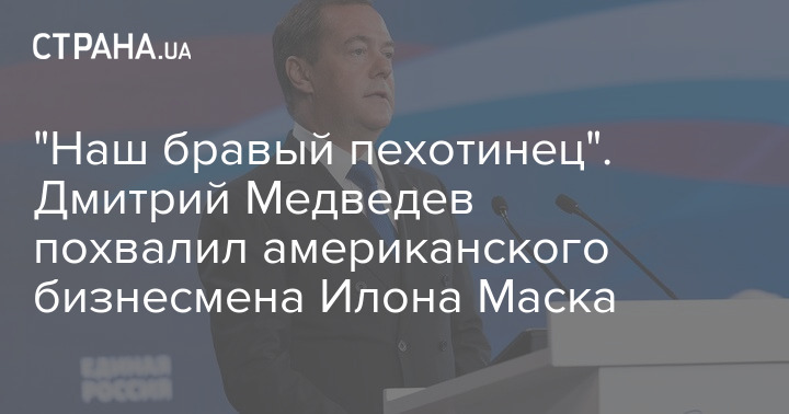 Заместитель председателя Совета безопасности РФ Дмитрий Медведев назвал в своей речи основателя "Теслы" и владельца "Твиттера" Илона Маска "нашим бравым пехотинцем".