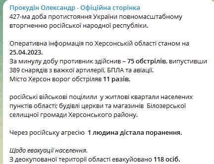 За минувшие сутки РФ 75 раз обстреляла Херсонскую область, выпустив 389 снарядов из тяжелой артиллерии, БПЛА и авиации.