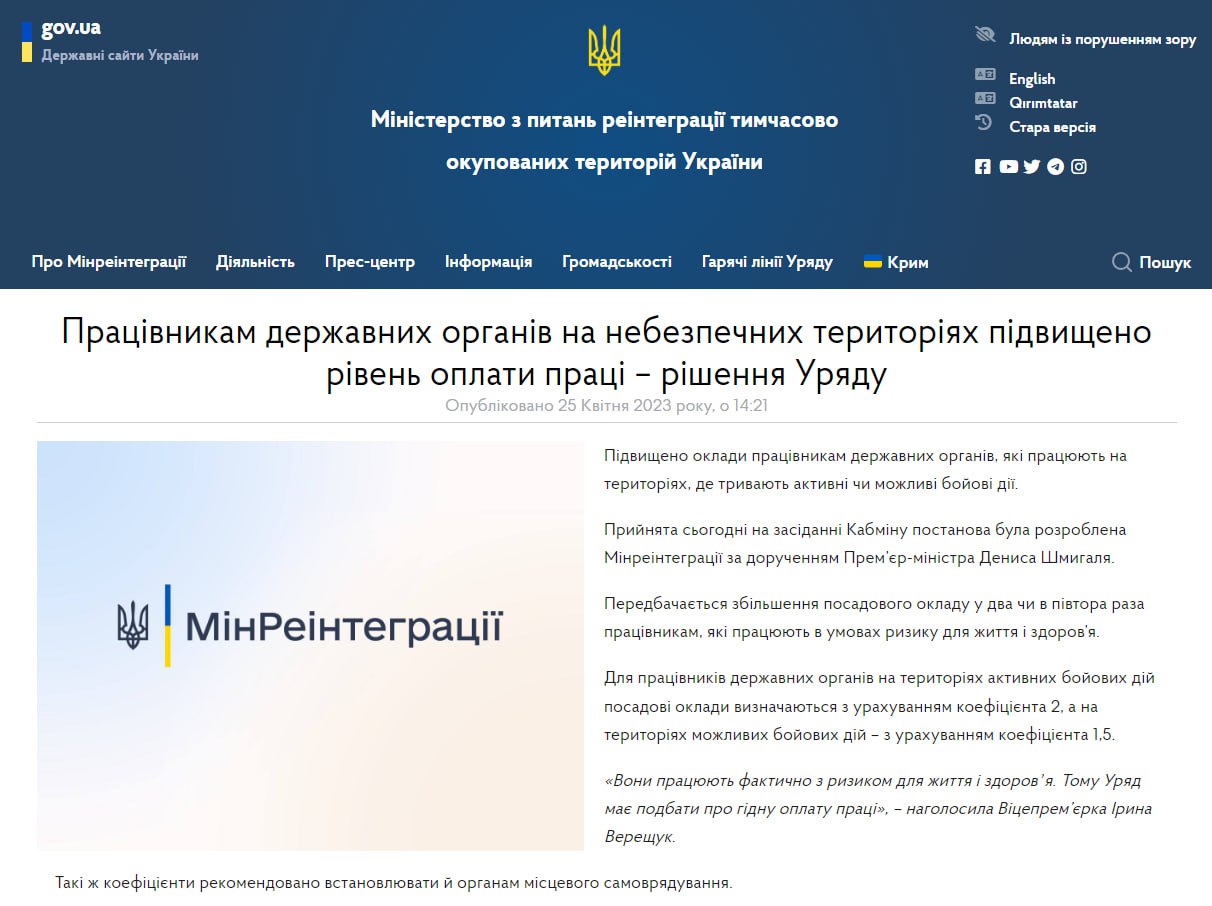 "Они работают фактически с риском для жизни и здоровья. Поэтому правительство должно позаботиться о достойной оплате труда", - заявила вице-премьер-министр - министр по вопросам реинтеграции временно оккупированных территорий Ирина Верещук.