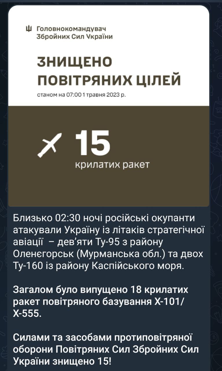 В общей сложности было выпущено 18 крылатых ракет воздушного базирования Х-101/Х-555. Из них уничтожено 15, заявляет Залужный.