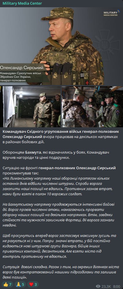10.00 ВСУ пошли в контратаку в Бахмуте, противник покинул некоторые позиции, сообщает медийная площадка Сил обороны Military Media Center со ссылкой на командующего Восточной группировки войск Александра Сырского