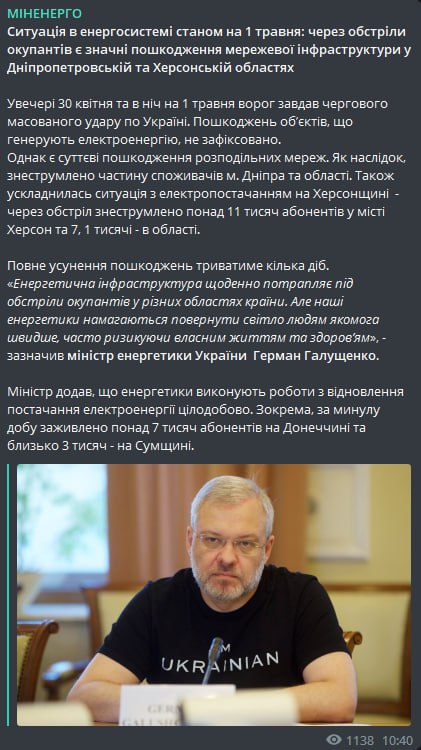 11.05 Массированный удар по Украине этой ночью привел к значительным повреждениям сетевой инфраструктуры в Херсонской и Днепропетровской областях, сообщают в Минэнерго.