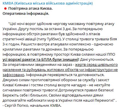 По данным главы  Киевской городской военной администрации, рашисты атаковали комплексно - одновременно крылатыми ракетами и дронами