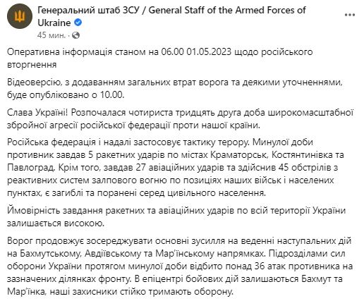1. За прошедшие сутки РФ нанесла 5 ракетных ударов по городам Краматорск, Константиновка и Павлоград. Кроме того, враг нанес 27 авиационных ударов и совершил 45 обстрелов из РСЗО по позициям ВСУ и населенным пунктам.