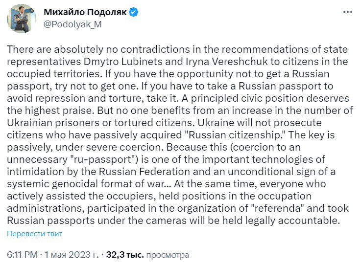 22.55 Советник главы Офиса президента Михаил Подоляк прокомментировал получение украинцами гражданства РФ на неподконтрольных территориях.