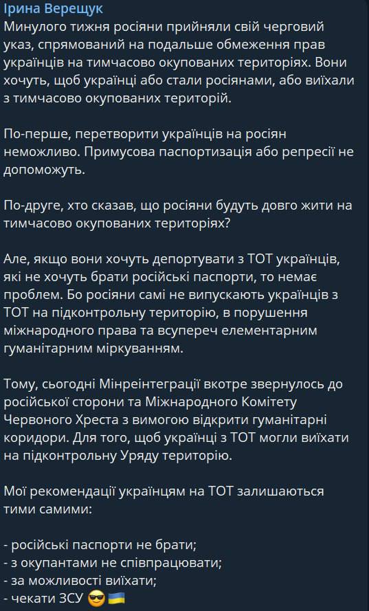 При этом всем кто активно помогал оккупантам, занимал должности в оккупационных администрациях, участвовал в организации «референдумов» и брал российские паспорта под камерами, будут привлечены к уголовной ответственности», – написал Подоляк в Твиттере.