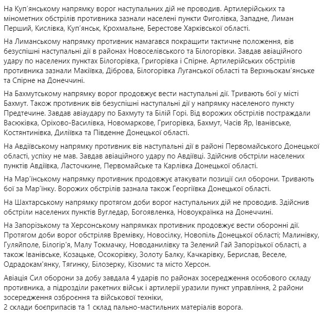 3. На Волынском, Полесском, Северском, Слободском, Купянском, Шахтерском, Запорожском и Херсонском направлениях обстановка без существенных изменений.