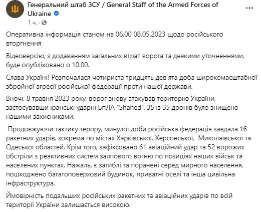 1. Ночью, 8 мая 2023 года, враг снова атаковал территорию Украины, применив иранские ударные БПЛА "Shahed". 35 из 35 дронов были уничтожены.