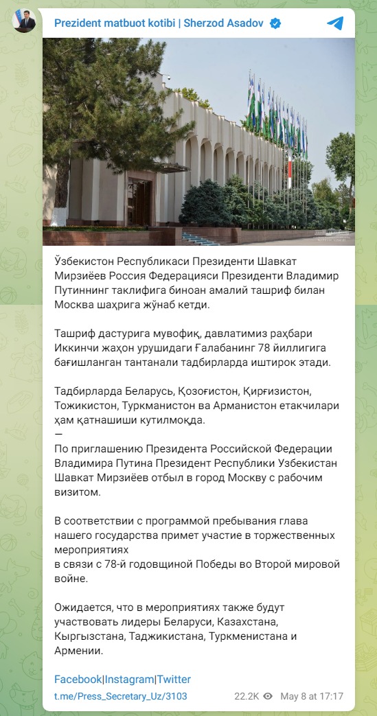 Состав гостей московского парада на 9 Мая продолжает расширяться. У президента Узбекистана Шавката Мирзиёева объявили, что 8 мая он отправился в Москву с рабочим визитом и примет участие в праздновании Дня Победы.