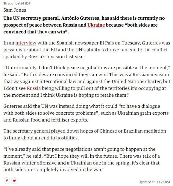 13.05 Сейчас нет никаких шансов на мир между Россией и Украиной, поскольку "обе стороны убеждены, что они могут победить", заявил генсек ООН Антониу Гутерриш в интервью испанской газете El Pais.
