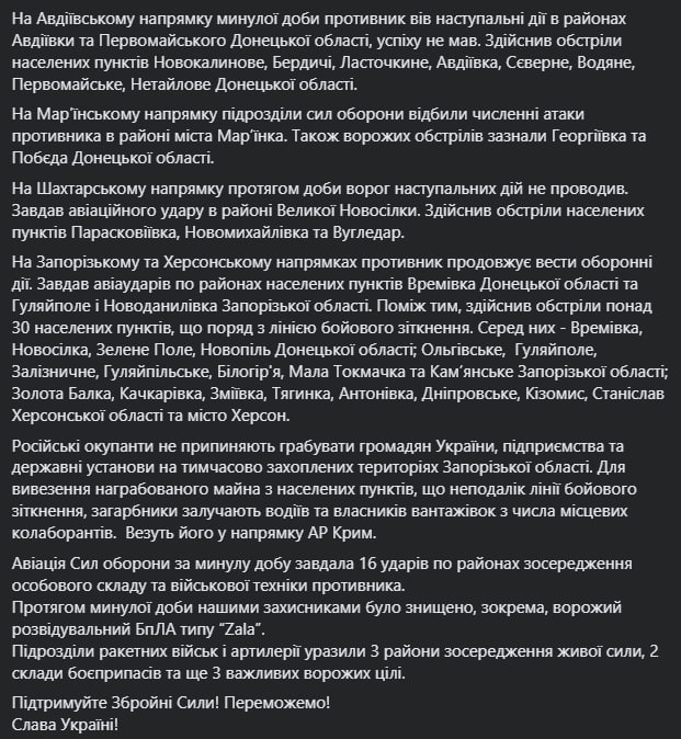3. На Волынском, Полесском, Северском, Слободском, Авдеевском, Шахтерском, Запорожском и Херсонском направлениях обстановка без существенных изменений.