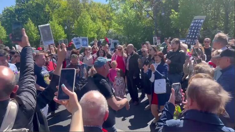 Паблики сообщают, что сначала немецкая полиция не пропускала тех, кто пришел с российской символикой, в частности, флагами РФ и георгиевскими ленточками, использование которых запретил суд