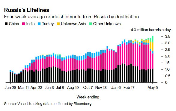 При этом доходы Москвы от продажи нефти сократились, упав в апреле до всего лишь трети прошлогоднего уровня из-за санкций и ценовых ограничений на ее экспорт.