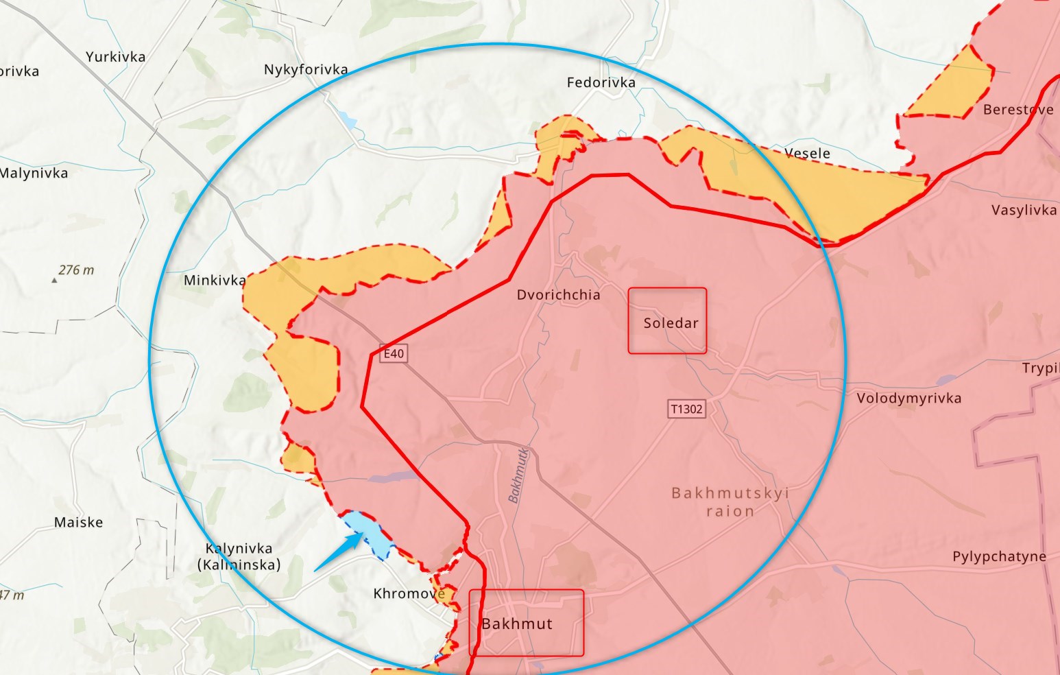 Это водохранилище находится на северо-запад от Бахмута и довольно давно являлось российским тылом, а бои шли южнее - у трассы Хромово - Часов Яр, которую россияне пытались перерезать, чтобы окружить украинскую группировку в Бахмуте.