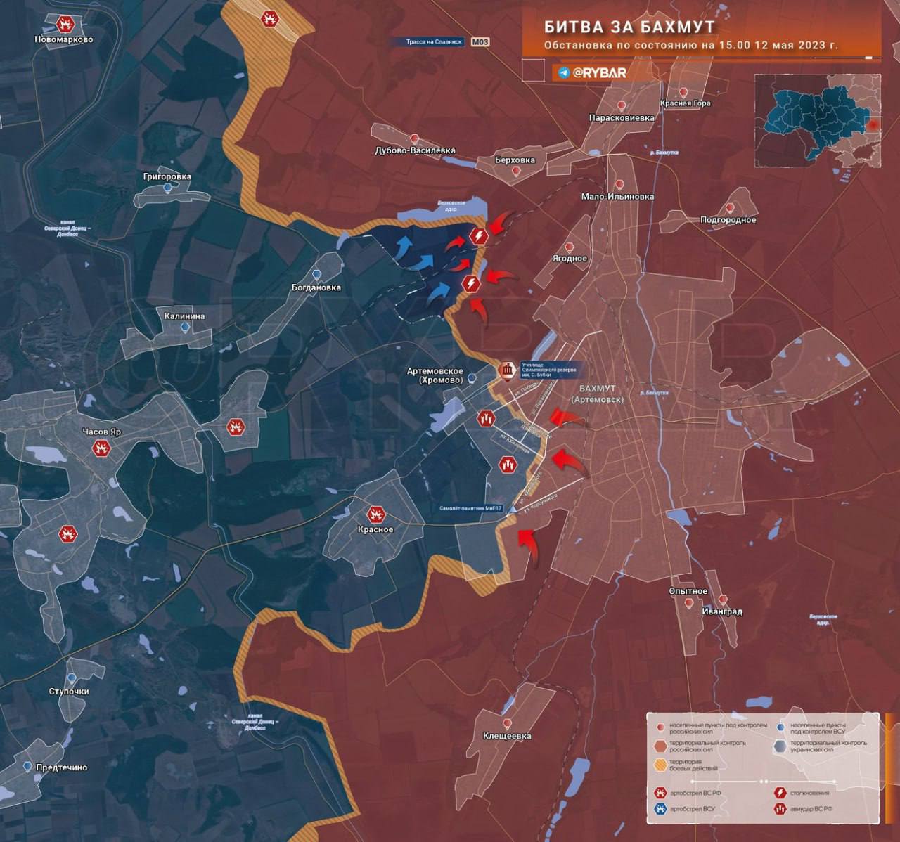 Таким образом "занятие рубежа" в Берховского водохранилища означает по сути отступление российских войск на север. Куратор ЧВК "Вагнер" Пригожин после выхода этой сводки МО РФ обвинил российскую армию в бегстве с позиций у трассы на Часов Яр (направление контрудара ВСУ на карте указано синими стрелками).