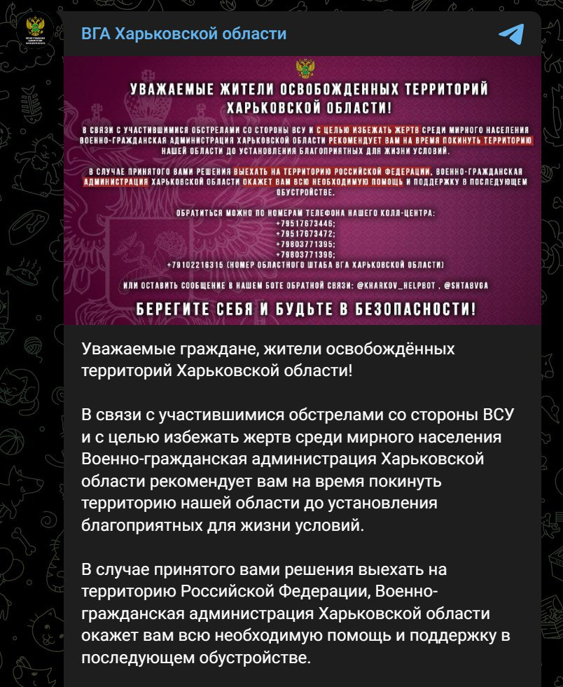 Назначенные Россией "власти Харьковской области", контролирующие небольшую территорию на востоке региона, объявили об эвакуации.