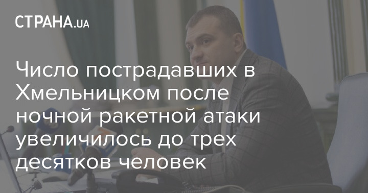 Число пострадавших в результате ночной атаки по Хмельницкому выросло до 30 человек. Ранее сообщалось о 21 пострадавшем.