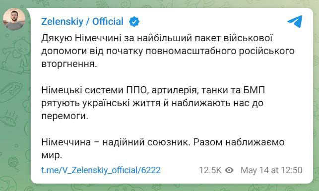 "Благодарю Германию за самый большой пакет военной помощи с начала полномасштабного российского вторжения. Немецкие системы ПВО, артиллерия, танки и БМП спасают украинские жизни и приближают нас к победе", - написал Зеленский.