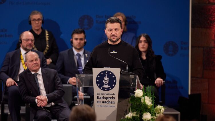 Вместо традиционного вечернего обращения Владимир Зеленский в конце дня опубликовал полное видео своей речи в Аахене (Германия), где ему торжественно вручили Международную дали премию имени Карла Великого.