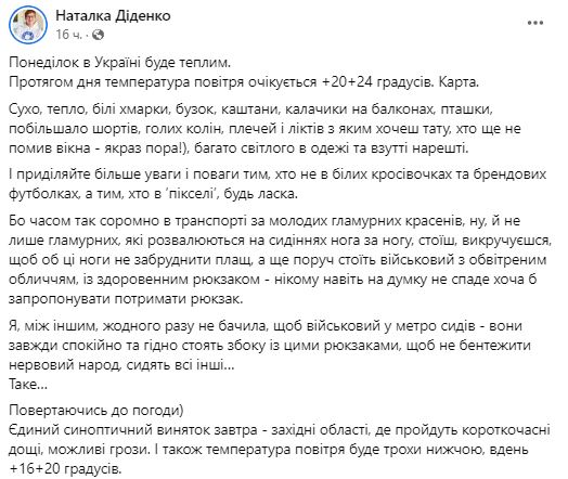 Синоптик Наталья Диденко пишет, что понедельник в Украине будет теплым. В течение дня температура воздуха ожидается +20...+24 градуса.