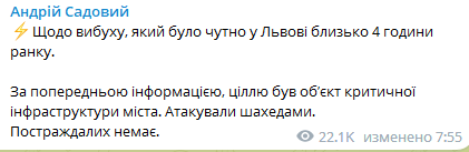 "По предварительной информации, целью был объект критической инфраструктуры города. Атаковали шахедами. Пострадавших нет", - написал Садовой.