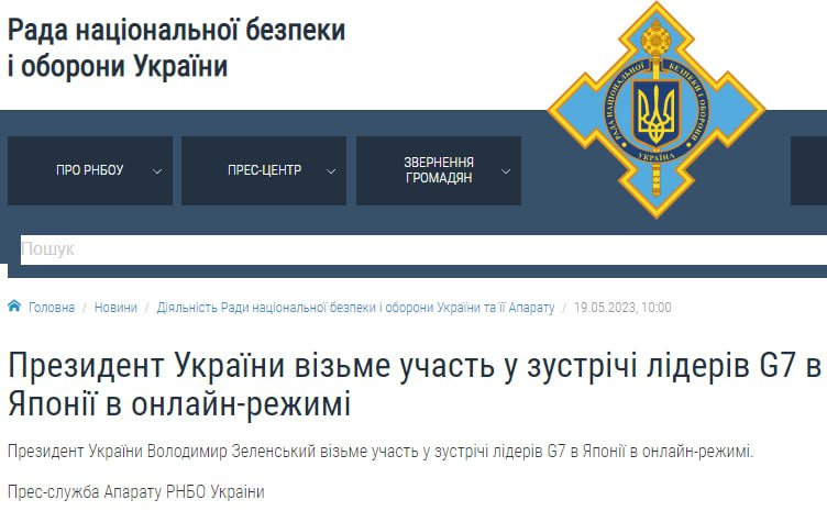 СНБО заявляет, что президент Украины все-таки не поедет в Хиросиму лично, как заявляет Bloomberg, а примет в нем участие онлайн.